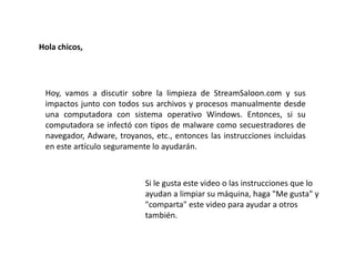 El documento proporciona instrucciones detalladas para limpiar una computadora con Windows afectada por malware relacionado con streamsaloon.com. Se incluyen pasos sobre cómo iniciar el sistema en modo seguro, deshabilitar o eliminar extensiones maliciosas en varios navegadores, eliminar procesos sospechosos del administrador de tareas y limpiar entradas de registro manipuladas. Además, se destacan medidas de precaución que los usuarios deben tener en cuenta antes de seguir las instrucciones para evitar problemas adicionales con su sistema.
