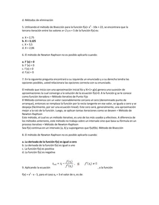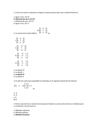 El documento contiene 15 preguntas sobre conceptos matemáticos como determinantes, sistemas de ecuaciones, métodos de resolución numérica como bisección, punto fijo y Newton-Raphson, y tipos de errores como error absoluto y relativo. Las preguntas requieren identificar definiciones correctas, aplicar fórmulas o realizar cálculos para encontrar valores numéricos.