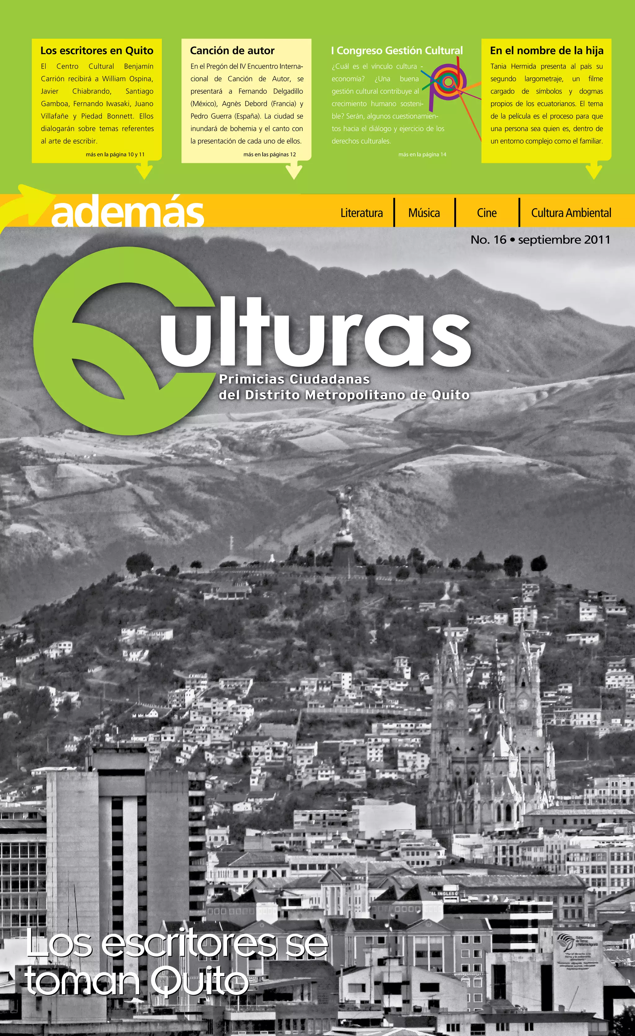 El documento describe varios eventos culturales que tendrán lugar en Quito durante el mes de septiembre. Entre ellos se encuentran el Festival del Requinto, Ecuador Jazz, el festival de arte urbano Al Zur-ich, talleres de danza libre, conciertos de música, proyecciones de películas, exposiciones y el Festival Internacional Videodanza Ecuador. Quito fue nombrada Capital Americana de la Cultura 2011 y celebrará este título con una amplia agenda cultural durante el mes.