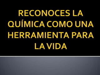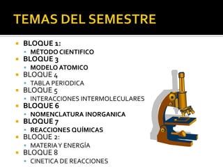 El documento describe los principales conceptos de la química. Se divide en 8 bloques que cubren temas como el método científico, el modelo atómico, la tabla periódica, las interacciones intermoleculares, la nomenclatura inorgánica, las reacciones químicas, la materia y la energía, y la cinética de reacciones. También incluye ejemplos prácticos de conceptos químicos y una lista de premios Nobel relacionados con avances en esta ciencia.