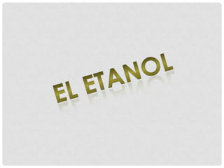 El documento describe las propiedades químicas del etanol o alcohol etílico, un líquido incoloro e inflamable con un punto de ebullición de 78°C. Explica que se obtiene principalmente por fermentación de azúcares por bacterias y levaduras, y también por destilación azeotrópica de mezclas de benceno o ciclohexano. Sus principales usos son en la síntesis de compuestos químicos como el ácido acético y el acetaldehído, así como en la fabricación de barnices,