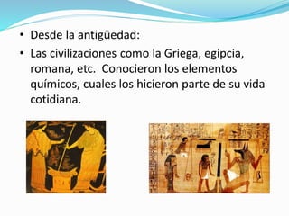 El documento resume la historia y desarrollo de la estructura atómica desde las primeras teorías griegas hasta los modelos atómicos modernos. Explica que los átomos están compuestos de un núcleo central con protones y neutrones rodeados por electrones, y que los electrones se distribuyen en niveles y subniveles de energía de acuerdo a sus números cuánticos. También describe los diferentes tipos de enlaces químicos y reacciones.