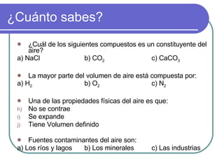 Este documento describe la composición química de la atmósfera terrestre. Explica que está compuesta principalmente por nitrógeno, oxígeno, argón y dióxido de carbono. También describe las capas de la atmósfera y sus funciones, como proteger de la radiación ultravioleta a través de la capa de ozono y almacenar agua para el ciclo hidrológico. Además, explica las propiedades físicas y químicas de los principales gases atmosféricos como el oxígeno