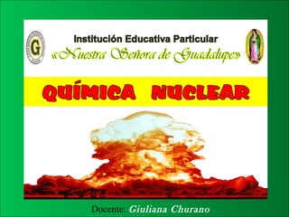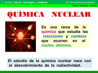 La química nuclear estudia las reacciones en el núcleo atómico y surgió con el descubrimiento de la radiactividad por Becquerel en 1896. Marie Curie descubrió luego los elementos radiactivos polonio y radio. La radiactividad ocurre cuando un núcleo inestable se desintegra emitiendo radiaciones alfa, beta o gamma de diferente poder de penetración. La radiactividad artificial se produce al bombardear núcleos estables. La exposición a radiaciones puede causar efectos como cáncer y mutaciones.