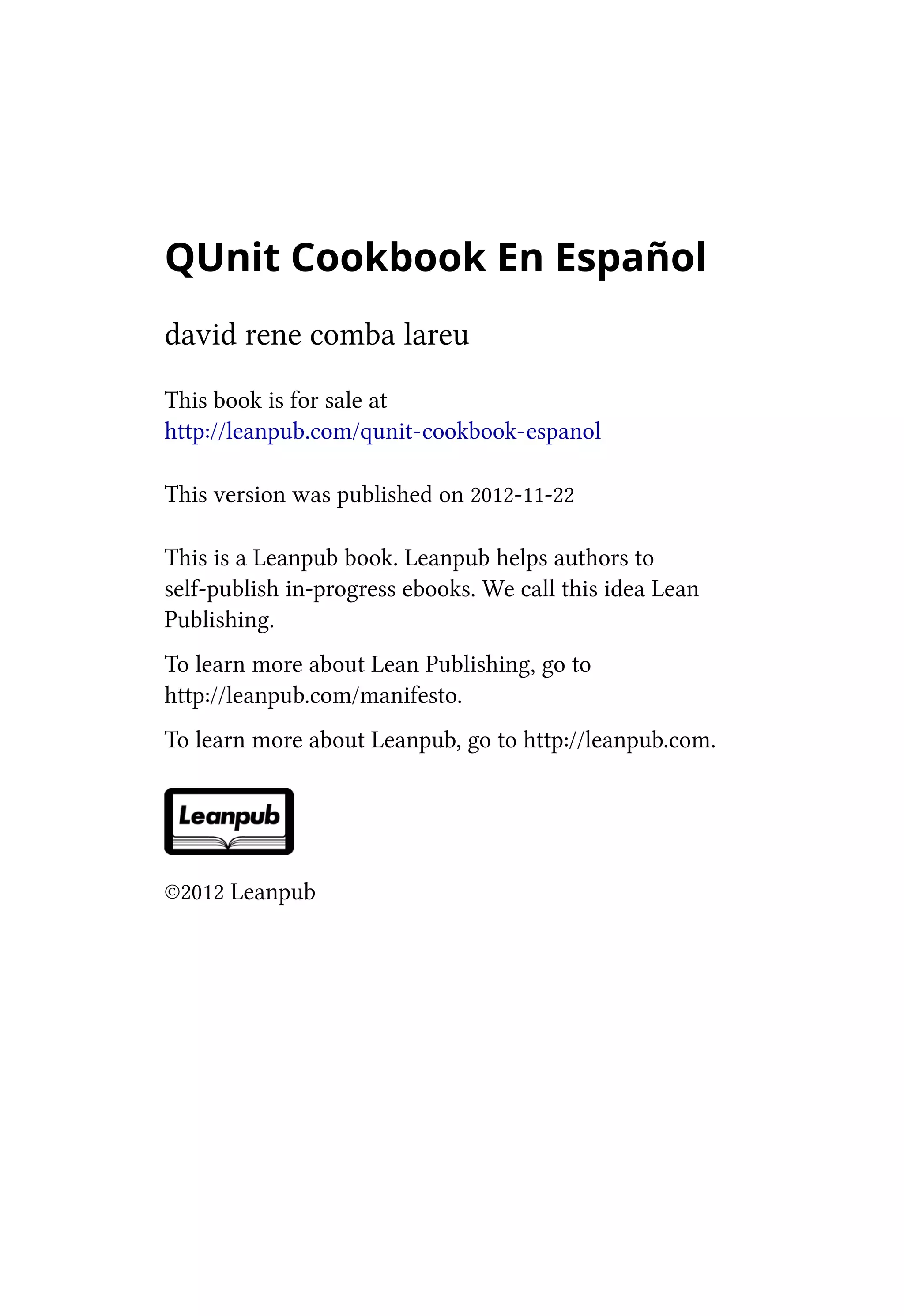 El 'QUnit Cookbook' en español es una guía sobre la automatización de pruebas unitarias en JavaScript utilizando QUnit, el framework de pruebas de jQuery. El libro abarca temas como la escritura de tests, el manejo de pruebas asincrónicas y la organización de pruebas, proporcionando herramientas y técnicas para asegurar un desarrollo eficiente y limpio. Se discuten fundamentos fundamentales como el diseño guiado por pruebas y las técnicas para mantener tests atómicos y sin efectos secundarios.