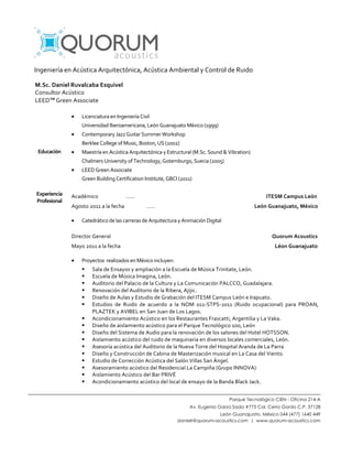 Quorum Acoustics es una empresa especializada en acústica arquitectónica, acústica ambiental y control de ruido. Ofrece servicios como aislamiento acústico, acondicionamiento acústico, estudios de ruido ambiental e industrial, y diseño y construcción de estudios de grabación, entre otros. Su objetivo es crear entornos con condiciones acústicas óptimas.