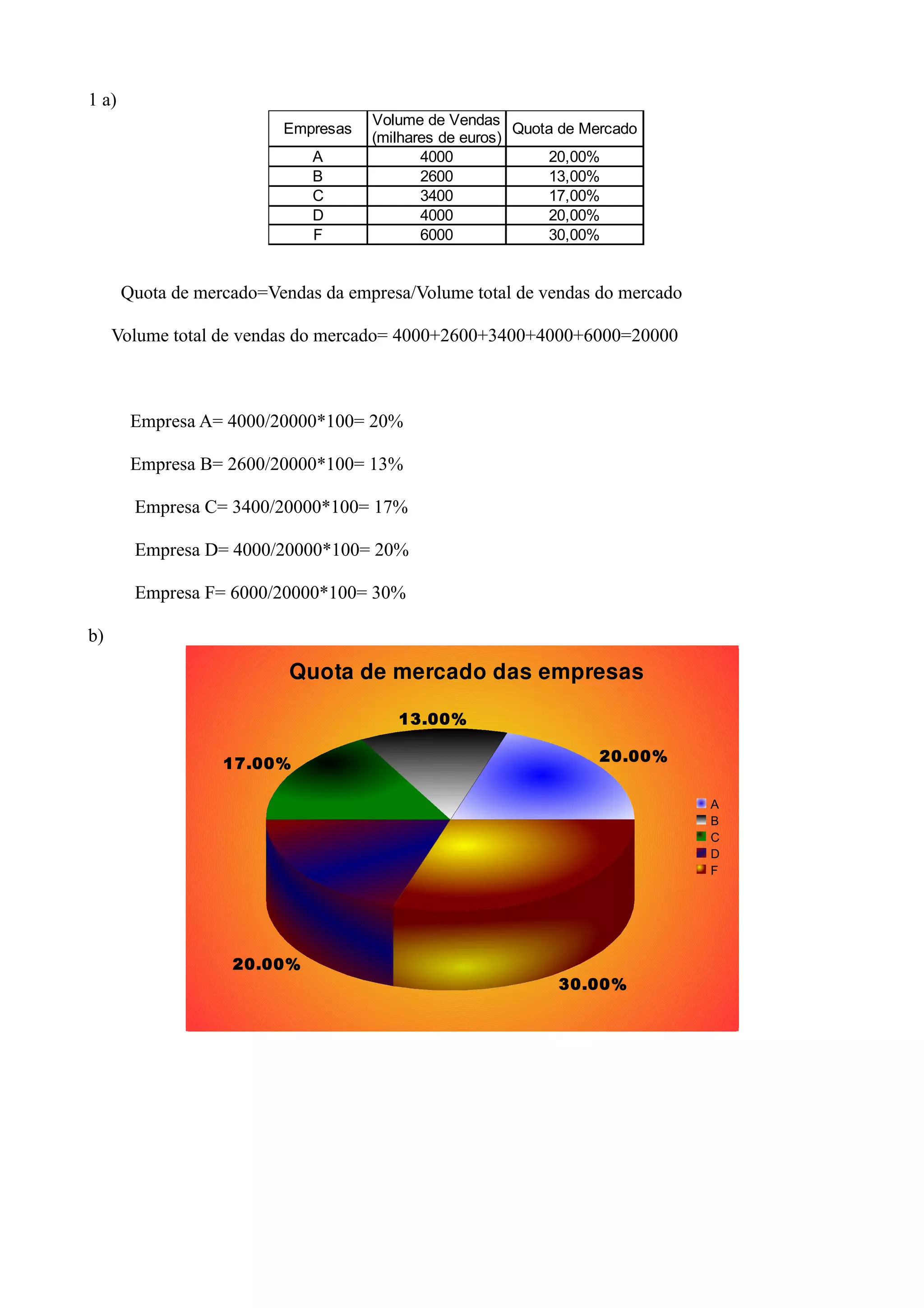 El documento presenta las ventas y cuotas de mercado de 5 empresas (A, B, C, D, F) en miles de euros. La empresa F tiene la mayor cuota de mercado con un 30%, seguida de A y D con un 20% cada una. La empresa B tiene la cuota más baja con un 13%. Adicionalmente, se muestra un gráfico de barras comparando las cuotas de mercado de cada empresa.