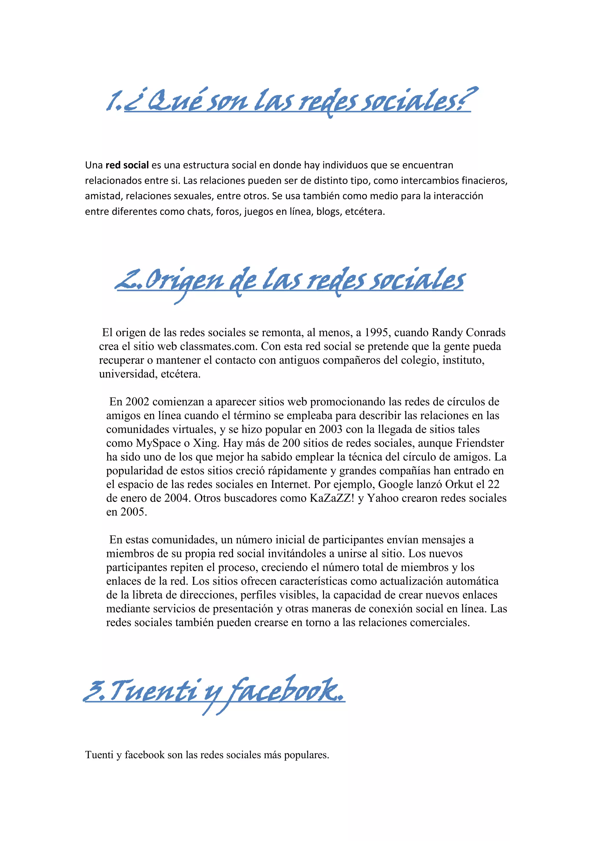 Las redes sociales son estructuras sociales donde los individuos se relacionan entre sí de diferentes formas como amistad o intercambios financieros. Las primeras redes sociales en línea surgieron en 1995 permitiendo a la gente mantener contacto con antiguos compañeros, y sitios como MySpace y Facebook se hicieron populares en la década de 2000. Tuenti y Facebook son actualmente las redes sociales más populares en España, siendo Tuenti una herramienta para mantenerse al tanto de amigos cercanos y Facebook una red formada por varias comunidades relacionadas