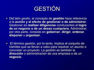 El documento trata sobre los conceptos de gestión, administración y organizaciones. Explica que la gestión implica realizar acciones para lograr un objetivo o proyecto, mientras que la administración se refiere a gobernar, dirigir u organizar. También describe los procesos de planeación, organización, dirección y control que componen la administración, así como factores como la misión, objetivos, análisis FODA y entorno de una organización.