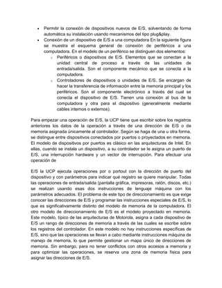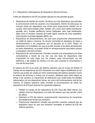 El documento describe los tres tipos principales de dispositivos de entrada/salida y cómo se conectan a la computadora a través de controladores. Los controladores permiten la comunicación entre los dispositivos y la CPU mediante registros. Los controladores de dispositivos requieren de manejo por parte del sistema operativo a través de manejo de dispositivos (device drivers) para facilitar la conexión y uso de los dispositivos.