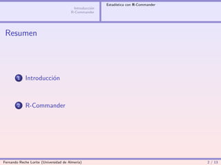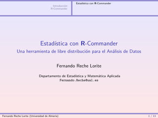 El documento presenta R-Commander, una herramienta de análisis estadístico gratuita que facilita la realización de análisis y gráficos tanto a usuarios novatos como avanzados. Destaca las ventajas de R, como su amplia disponibilidad y documentación, así como desventajas como su interfaz gráfica simple y la necesidad de introducir órdenes manualmente. R-Commander ofrece un entorno gráfico que simplifica el uso de R, aunque solo cubre una parte limitada de sus capacidades.