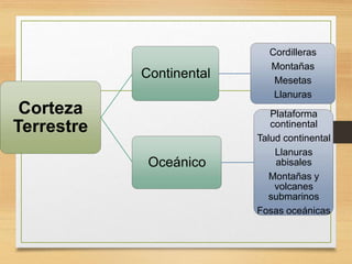 El documento describe el relieve continental y oceánico. El relieve continental incluye cordilleras, montañas, mesetas y llanuras. El relieve oceánico consiste en la plataforma continental, el talud continental, las llanuras abisales, las montañas y volcanes submarinos, y las fosas oceánicas. El documento también explica las características de cada uno de estos componentes del relieve.