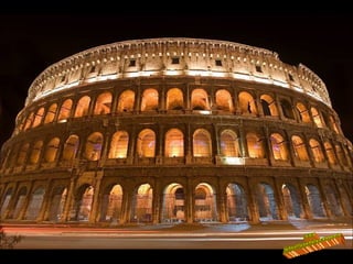 Este documento presenta una lista de lugares icónicos y atracciones turísticas populares en Roma, Italia, incluyendo el Coliseo, el Foro Romano, la Fontana di Trevi, la Piazza Navona, el Panteón, el Castillo Sant'Angelo, el Puente Milvio, San Juan de Letrán, las Termas de Caracalla, la Basílica de San Pedro y la Capilla Sixtina en el Vaticano.