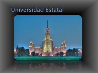El documento describe varios lugares importantes en Moscú, incluyendo el Estadio Luzhniki, las Colinas del Gorrión y la Universidad Estatal de Moscú. También describe la Plaza Roja, la Catedral de San Basilio y el antiguo poblado Kolómenskoye, que ahora alberga el Museo-Reserva Histórico-Arquitectónico Estatal "Kolómenskoye".