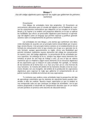 Este documento presenta 10 hojas de trabajo relacionadas con el desarrollo del pensamiento algebraico a través del uso de patrones numéricos y expresiones algebraicas. Cada hoja de trabajo presenta un patrón numérico y guía al estudiante a descubrir la regla subyacente y expresarla algebraicamente. El objetivo es que los estudiantes aprendan a usar el lenguaje algebraico para expresar generalizaciones sobre comportamientos de patrones numéricos.