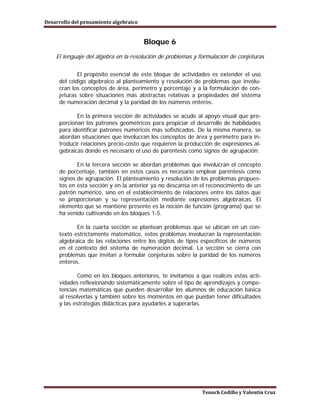 Este documento describe un bloque de actividades destinadas a extender el uso del lenguaje algebraico en la resolución de problemas y formulación de conjeturas. Se abordan problemas relacionados con conceptos como área, perímetro y porcentaje, requiriendo el uso de expresiones algebraicas y paréntesis. También se plantean problemas para identificar patrones numéricos y formular conjeturas sobre las propiedades de los números enteros y el sistema decimal. El objetivo es desarrollar habilidades algebraicas en los estudiantes.