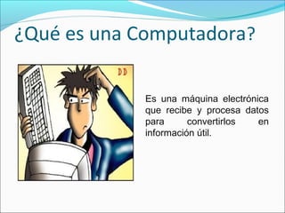 Este documento define las partes principales de una computadora, incluyendo el hardware y el software. El hardware se refiere a los componentes físicos como el procesador, la memoria, los dispositivos de entrada y salida. El software incluye sistemas operativos, lenguajes de programación y datos e información. La computadora recibe datos a través de dispositivos de entrada, los procesa con el hardware y el software, y produce información útil como salida.