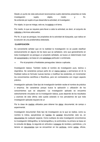 La investigación es un proceso sistemático que utiliza el método científico para obtener información relevante y confiable con el fin de entender, verificar o aplicar el conocimiento. Existen diferentes tipos de investigación clasificados según su objetivo, métodos, alcance y otros factores. La investigación es fundamental para el desarrollo del conocimiento y la solución de problemas tanto para estudiantes como profesionales.