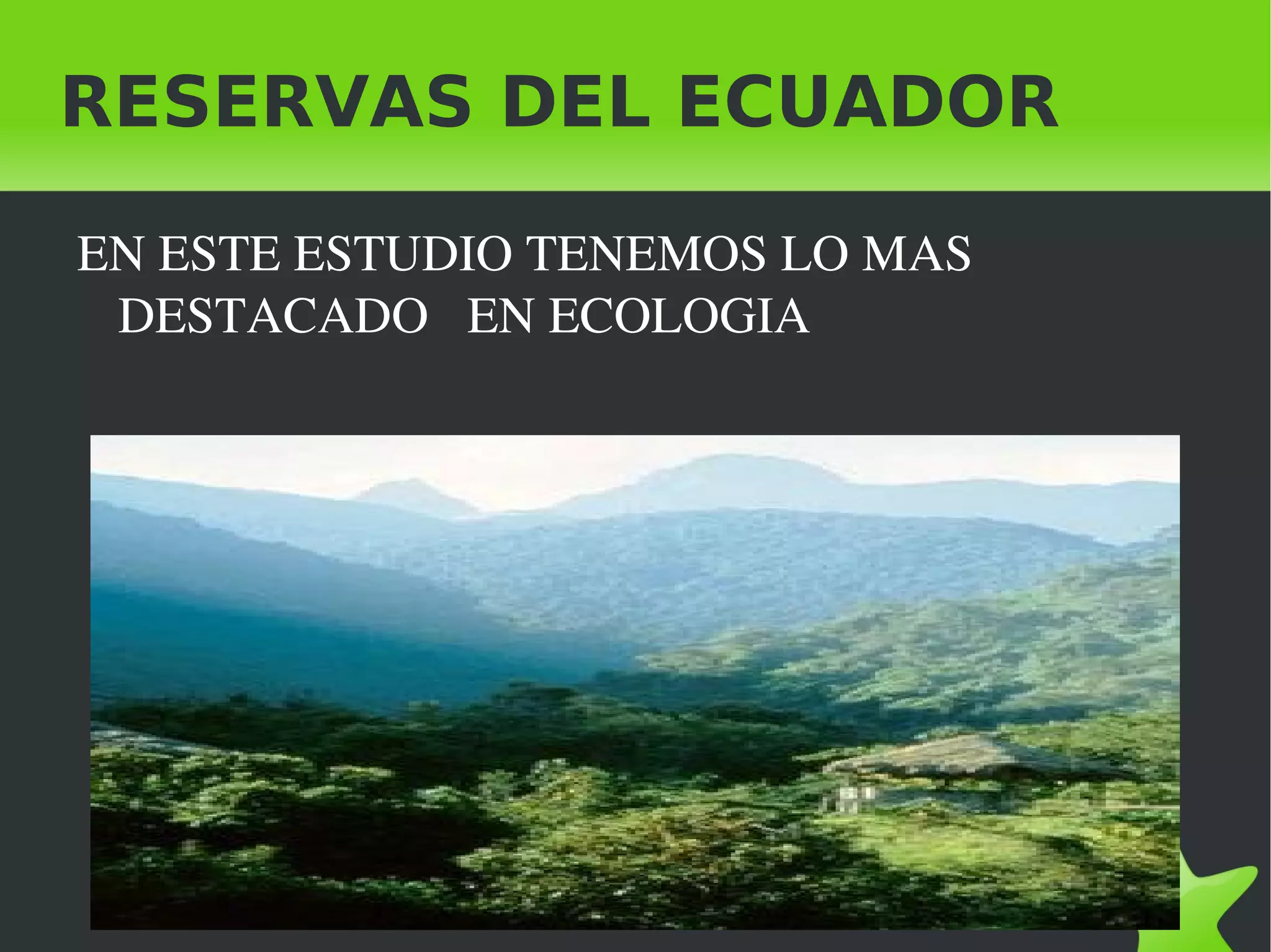Este documento enumera cuatro reservas ecológicas importantes en Ecuador: la Reserva Ecológica Cayapas - Mataje, la Reserva Ecológica Mache - Chindul, el Parque Nacional Machalilla y la Reserva Ecológica Manglares - Churute.