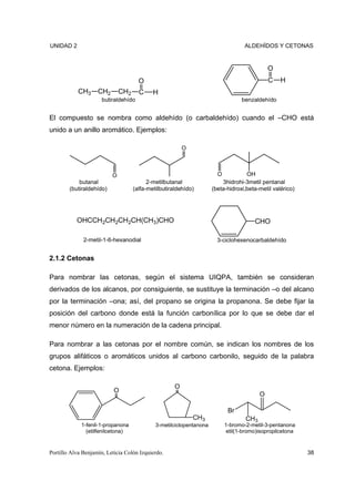 Este documento trata sobre aldehídos y cetonas. Explica la nomenclatura, estructura y propiedades de estos compuestos carbonílicos. También describe métodos comunes para la obtención de aldehídos, como la oxidación de alcoholes primarios y la oxidación controlada de metilbencenos.