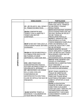 Este documento presenta un análisis DOFA personal de Jessica Viviana Martínez Cárdenas. Identifica sus debilidades, fortalezas, oportunidades y amenazas. Entre las debilidades se encuentran el mal genio, la envidia y la mentira. Entre las fortalezas están ser feliz, luchadora y educada. Las oportunidades incluyen el trabajo y la buena educación. Y entre las amenazas se mencionan el desempleo, la violencia y la soledad. El documento propone formas de aprovechar las oportunidades