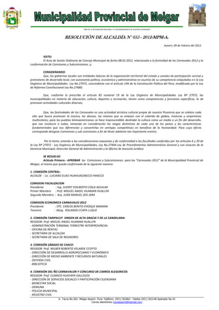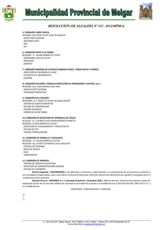 La resolución designa comisiones y subcomisiones para organizar los carnavales de 2012 en la Municipalidad Provincial de Melgar en Puno, Perú. Las comisiones se encargarán de diferentes aspectos como la recepción de ofrendas, la pandilla, premios, difusión, atención al público, y coordinar actividades como el desfile de carros alegóricos y espectáculos hípicos. La gerencia municipal y dirección general de administración supervisarán el cumplimiento de la resolución.