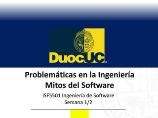 Este documento presenta tres temas clave sobre problemáticas en ingeniería de software: 1) Problemas comunes como imprecisión en costos y planificación, baja productividad y calidad variable; 2) Mitos de gestión, clientes y desarrolladores que afectan negativamente el desarrollo de software; 3) La necesidad de adoptar un enfoque de ingeniería para derribar mitos y mejorar el desarrollo y producto de software.