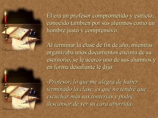 Un alumno desafiante le dice al profesor que está feliz de haber terminado la clase para no tener que escuchar más sus tonterías. En lugar de ofenderse, el profesor le explica tranquilamente que cuando alguien intenta ofenderlo le está ofreciendo una emoción como la rabia o el rencor, la cual él puede decidir no aceptar para conservar su propia serenidad. El profesor concluye diciendo que aunque no podemos controlar los sentimientos de los demás, sí podemos elegir los nuestros y optar por ser felices.