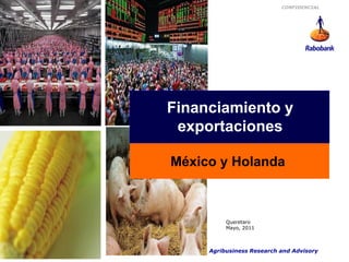 El documento analiza el mercado global de la carne de res y las oportunidades de exportación entre México y Holanda. Señala que a pesar del crecimiento del comercio mundial, las exportaciones de México a Holanda son bajas, incluyendo las exportaciones agroalimentarias. Esto se debe en parte a la falta de financiamiento para el sector agroalimentario en México por parte de la banca comercial y de desarrollo, lo que ha llevado a una cartera vencida alta. Rabobank busca entender mejor el sector para des