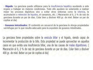 La raíz es una parte fundamental de las plantas. Absorbe agua y minerales del suelo y los transporta a otras partes de la planta. Las raíces se clasifican por su origen (primaria, secundaria, adventicia) y morfología (pivotante, fibrosa). Algunas raíces se especializan en almacenar alimentos. Plantas como la ipecacuana, valeriana y genciana se usan comúnmente en medicina debido a sus propiedades farmacéuticas.
