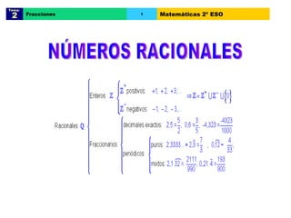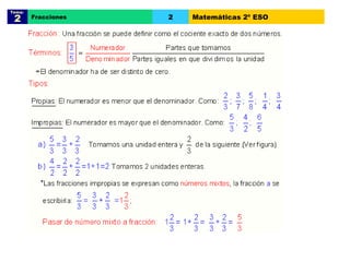 El documento trata sobre las fracciones en matemáticas de 2o de ESO. Explica conceptos como fracciones equivalentes, comparación y ordenación de fracciones, suma y resta de fracciones con el mismo y distinto denominador, multiplicación, división, potencias y raíces cuadradas de fracciones, y operaciones con fracciones positivas y negativas. Incluye ejemplos y problemas resueltos para cada tema.