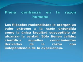 El documento presenta una serie de filósofos racionalistas y sus ideas. Algunos de los filósofos mencionados son: Sócrates, Platón, Aristóteles, Descartes, Francis Bacon, Galileo y Pascal. El racionalismo sostiene que el conocimiento proviene de la razón y las ideas innatas, no de la experiencia. Los racionalistas buscaban establecer un método para alcanzar certezas absolutas y crear una ciencia universal basada en la razón y las matemáticas. El mecanicismo, que ve el mundo como una máquina