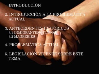 El documento resume la problemática del racismo. Explica que el racismo afecta a muchos aspectos de la sociedad como la educación y el empleo. También analiza los antecedentes históricos del racismo contra gitanos e inmigrantes magrebíes en España y la legislación actual contra la discriminación racial.