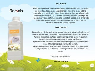 Este documento presenta una línea de productos de limpieza doméstica y comercial llamada Racvals, incluyendo detergentes, suavizantes, jabones y desinfectantes para diversas aplicaciones como lavandería, limpieza de superficies y el cuidado personal. Se proporcionan instrucciones de uso para cada producto así como sus precios. El documento también incluye los contactos de ventas para adquirir estos productos.