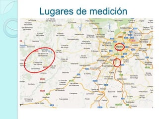 Este documento presenta los resultados de un experimento colectivo realizado por el IES San Mateo para medir la radiación ambiental en 11 lugares diferentes de la región de Madrid. Se incluyen las fechas, horas y coordenadas de cada punto de medición, así como los niveles de radiación medidos sin sonda y con sonda en microsieverts por hora (μSv/h). Los niveles de radiación variaron entre 0,050 a 0,578 μSv/h.
