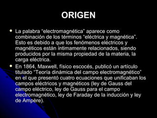 La radiación electromagnética tiene su origen en la unificación de los campos eléctricos y magnéticos descrita por las ecuaciones de Maxwell en 1864. Posee una naturaleza dual ondulatoria y corpuscular, comportándose como ondas al propagarse y como partículas llamadas fotones al interactuar con la materia, como demuestran los efectos fotoeléctrico y Compton. Presenta propiedades de difracción, reflexión y refracción propias de las ondas electromagnéticas.