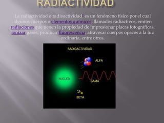 La radiactividad es un fenómeno por el cual algunos elementos químicos emiten radiaciones que pueden impresionar placas, ionizar gases y atravesar objetos. En 1896, Becquerel descubrió que sales de uranio emitían radiaciones espontáneamente. La radiactividad artificial se produce al bombardear núcleos estables con partículas. Las partículas alfa, beta y radiación gamma son los principales tipos de radiación. La radioterapia usa radiaciones para destruir células cancerosas y limitar daños a tej