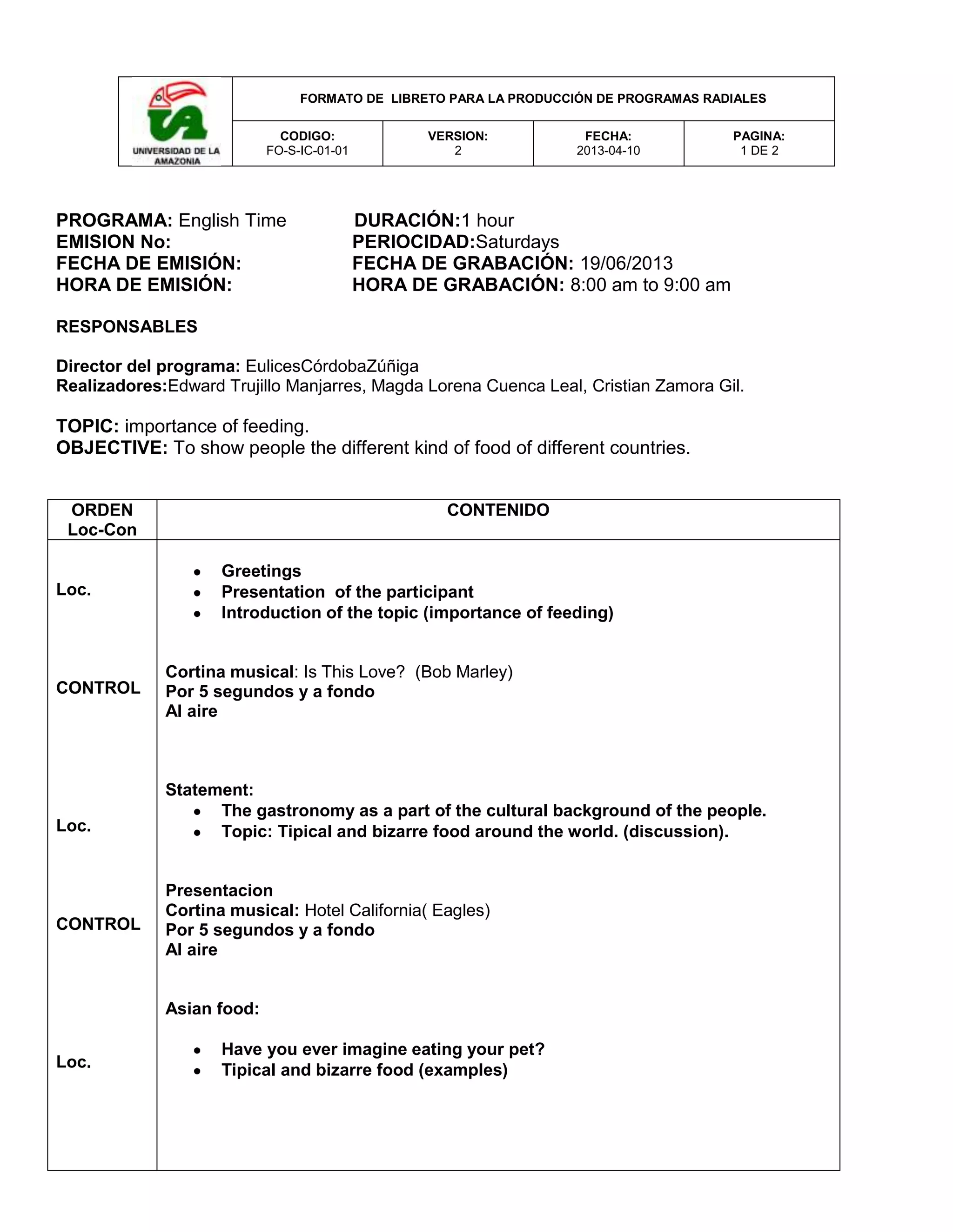 Este documento presenta el formato de libreto para un programa radial titulado "English Time" que se transmitirá los sábados de 8 a 9 am. El programa tratará sobre la importancia de la alimentación y mostrará diferentes tipos de alimentos de diferentes países. Incluirá discusiones sobre comidas típicas y extrañas de todo el mundo, con ejemplos de comidas asiáticas que incluyen animales de mascotas.