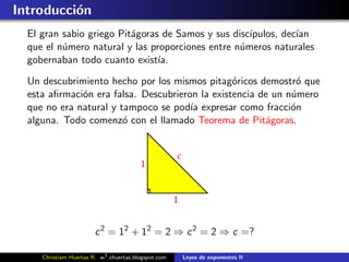 Este documento presenta las leyes de exponentes y radicación. Explica conceptos como raíces, exponentes fraccionarios y operaciones con raíces como suma, multiplicación y raíces sucesivas. Incluye definiciones, teoremas y ejemplos para ilustrar las propiedades y aplicaciones de las leyes de exponentes y radicación. Finalmente, propone algunos ejercicios para aplicar lo explicado.
