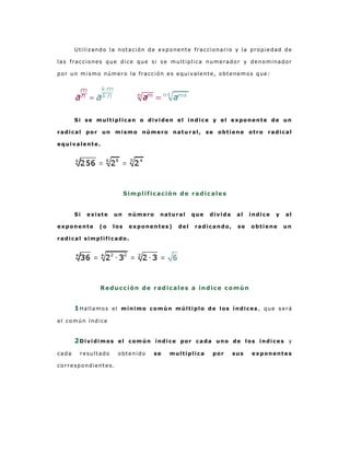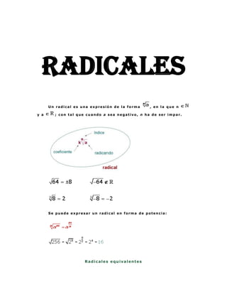 Este documento describe los conceptos básicos de los radicales, incluyendo su notación, propiedades, operaciones y simplificación. Explica que un radical es una expresión de la forma √n, donde n es un número natural y a es positivo o negativo dependiendo de si n es par o impar. Luego describe cómo expresar radicales como potencias fraccionarias y cómo simplificar y reducir radicales a un índice común. Finalmente, cubre las operaciones básicas con radicales como suma, multiplicación, división y elevar a potencias.
