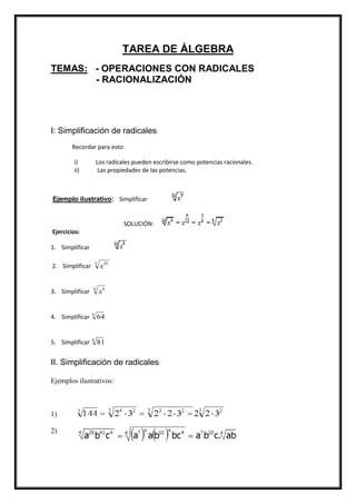 Este documento trata sobre operaciones con radicales y racionalización. Explica cómo simplificar radicales usando propiedades de potencias y cómo realizar operaciones con ellos. Luego, presenta ejercicios de simplificación de radicales, operaciones con ellos y racionalización de denominadores.