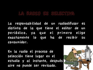 el mensaje esdecodificado por todos La radio esta al alcance de todo el mundo, pueden tener un radio a una tv La prensa (periòdicos, revistas, etc) sòlo pueden llevar el mensaje a los que saben leer.