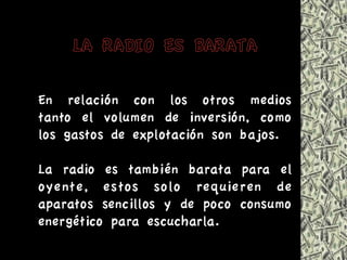 - La radio,como medio de comunicaciòn, tiene mayor penetraciòn; no hay que ser un ser alfabetizado Se suele utilizar el lenguaje màs sencillo de manera que tanto eruditos como analfabetos puedan comprender el mensaje