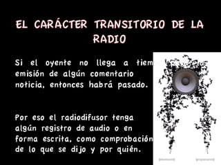 La radio esuna cosa mucho más personal, que llega directamente al oyente. Si el programa es transmitido "en vivo", entonces el radiodifusor disfruta de una conexión inmediata con el individuo.