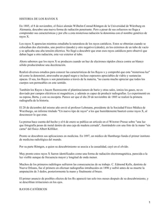 Wilhelm Röntgen descubrió los rayos X en 1895 mientras estudiaba los rayos catódicos. Observó que los rayos catódicos producían una nueva forma de radiación que podía atravesar materiales opacos a la luz. Realizó la primera radiografía de la historia usando esta radiación, que ahora sabemos que se produce cuando electrones chocan contra un blanco sólido. Pronto se descubrieron aplicaciones médicas de los rayos X, estableciéndose el primer instituto de radiología médica en 1897.