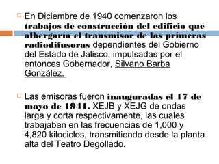 Las primeras radiodifusoras del estado de Jalisco fueron inauguradas en 1941 por el gobernador Silvano Barba González. XEJB transmitía en AM y XEJG en ondas cortas desde el Teatro Degollado. En 1959 se instaló la estación XEJB-FM en 96.4 MHz en la Casa de la Cultura Jalisciense. A finales de los 90, las estaciones fueron renombradas como "Jalisco Radio" aunque cada una mantiene su propio proyecto y perfil de audiencia. Recientemente se renovó el equipo de