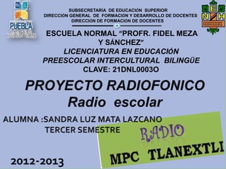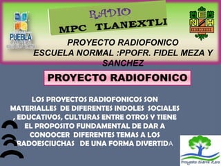 Este documento describe un proyecto radiofónico de la Escuela Normal "Prof. Fidel Meza y Sánchez" con el objetivo de educar e informar a los radioescuchas de una manera divertida e innovadora a través de varios programas como "Mis primeros pasitos al mundo de las letras", "El mundo mágico de la creatividad" y "La historia del pasado".