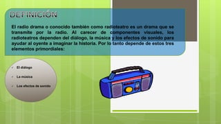 El documento describe el radioteatro o radio drama, un género que se transmite por radio y depende del diálogo, la música y los efectos de sonido para contar una historia sin elementos visuales. Explica que los radioteatros se basan en tres elementos principales - el diálogo, la música y los efectos de sonido - y también deben considerar el contenido, la historia y los personajes. Finalmente, resume algunas ventajas e inconvenientes del formato.