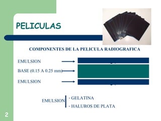 El documento describe los componentes y procesos de las películas radiográficas. La película consiste en una base de plástico transparente sobre la cual se aplica una emulsión fotosensible compuesta de microcristales de haluro de plata suspendidos en gelatina. La exposición a rayos X causa un cambio químico en los cristales que luego son revelados usando revelador y fijador químicos para producir la imagen radiográfica.