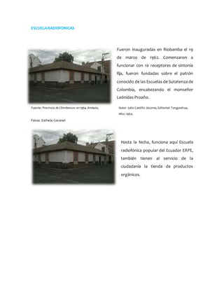 Las Escuelas Radiofónicas fueron inauguradas en Riobamba, Ecuador el 19 de marzo de 1962 con 10 receptores de radio fijos para recibir las transmisiones educativas, siguiendo el modelo de las Escuelas Radiofónicas de Sutatenza en Colombia y bajo el liderazgo de Monseñor Leónidas Proaño. Hasta 1964, la Escuela Radiofónica Popular del Ecuador continuaba transmitiendo programas educativos para la ciudadanía de Riobamba y operando una tienda de productos orgánicos.